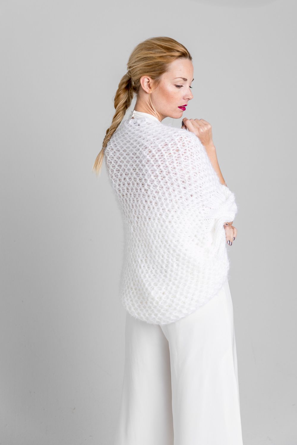 Kuscheliger Oversized-Bolero aus hochwertiger Merinowolle - weich, warm und stilvoll. Ein lässiger Layer mit viel Volumen für moderne Bräute mit Sinn für Komfort. Nur als One Size erhältlich.