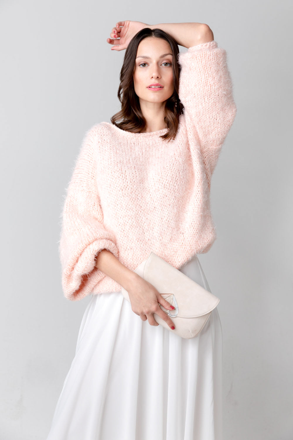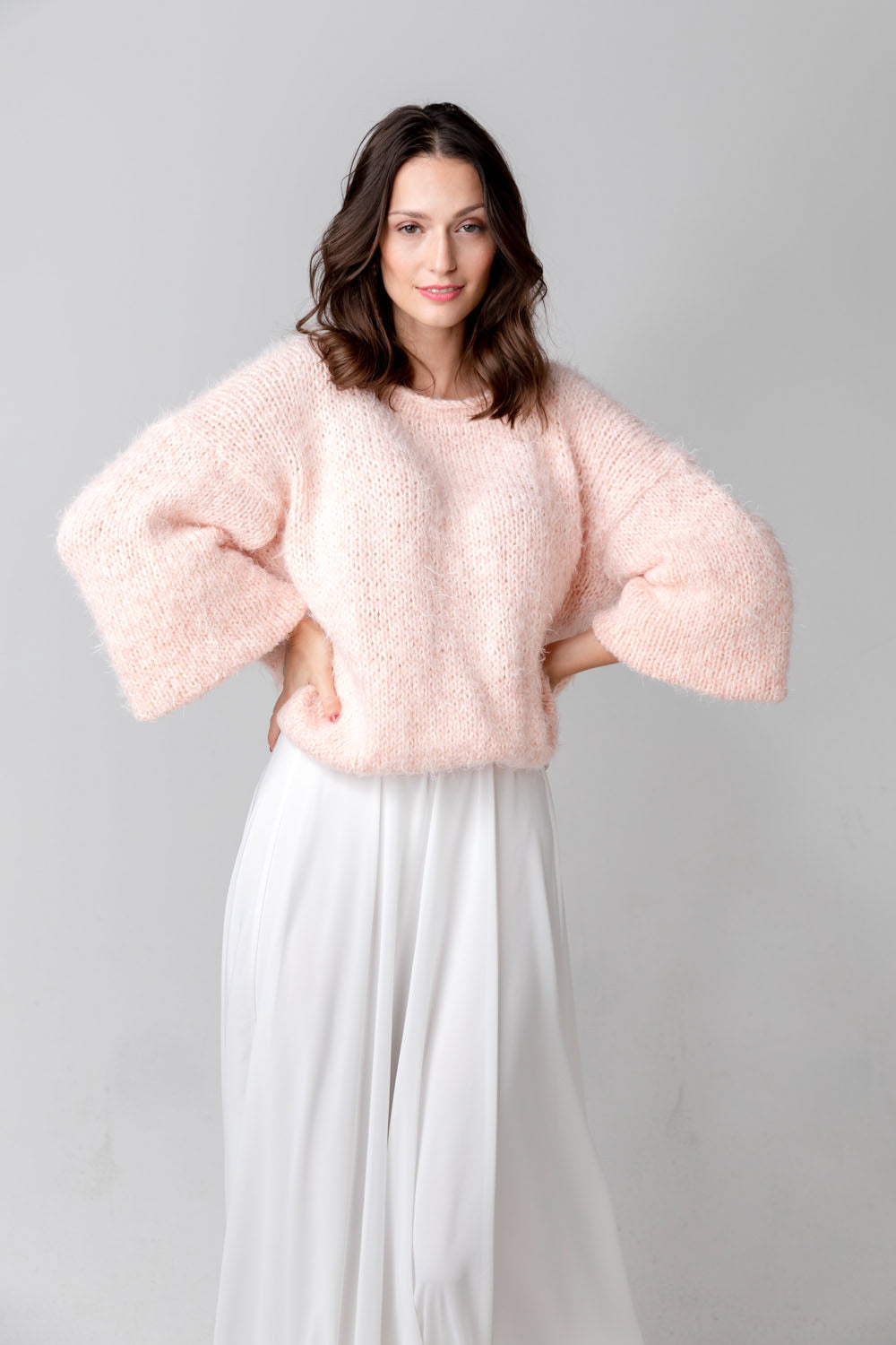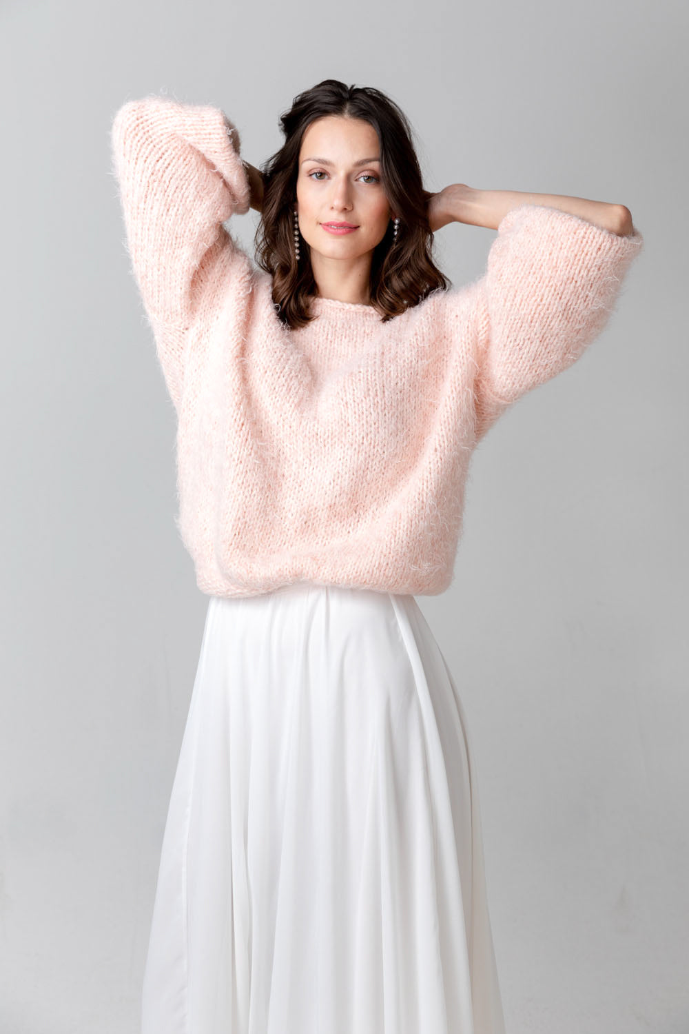 Handgestrickter, extra oversized Brautpullover aus flauschigem Garn mit tiefem V-Ausschnitt am Rücken, in glattem Strick mit langen Ballonärmeln. Lässiges als Oberteil zu Hosen und Röcken.