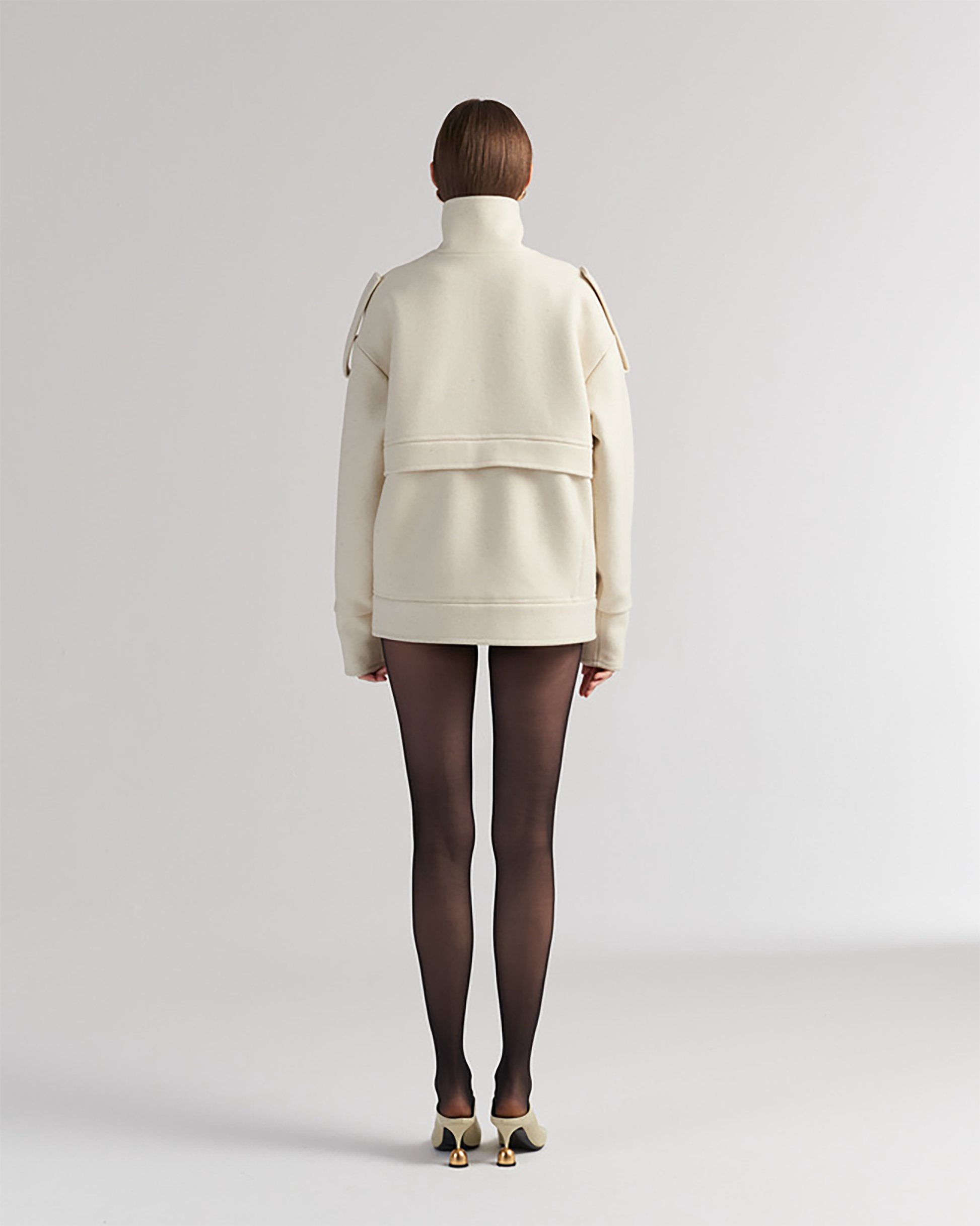 Eine lange, leicht oversized geschnittene Jacke mit markantem, breitem Stehkragen und dekorativen Epauletten auf den Schultern. Die Ärmel sind mit extraweiten Manschetten verlängert, was der Silhouette eine moderne, klare Linie verleiht. Zwei vordere Taschen sorgen für Funktionalität, während der verdeckte Reißverschluss mit dekorativer Leiste die puristische Optik abrundet.
