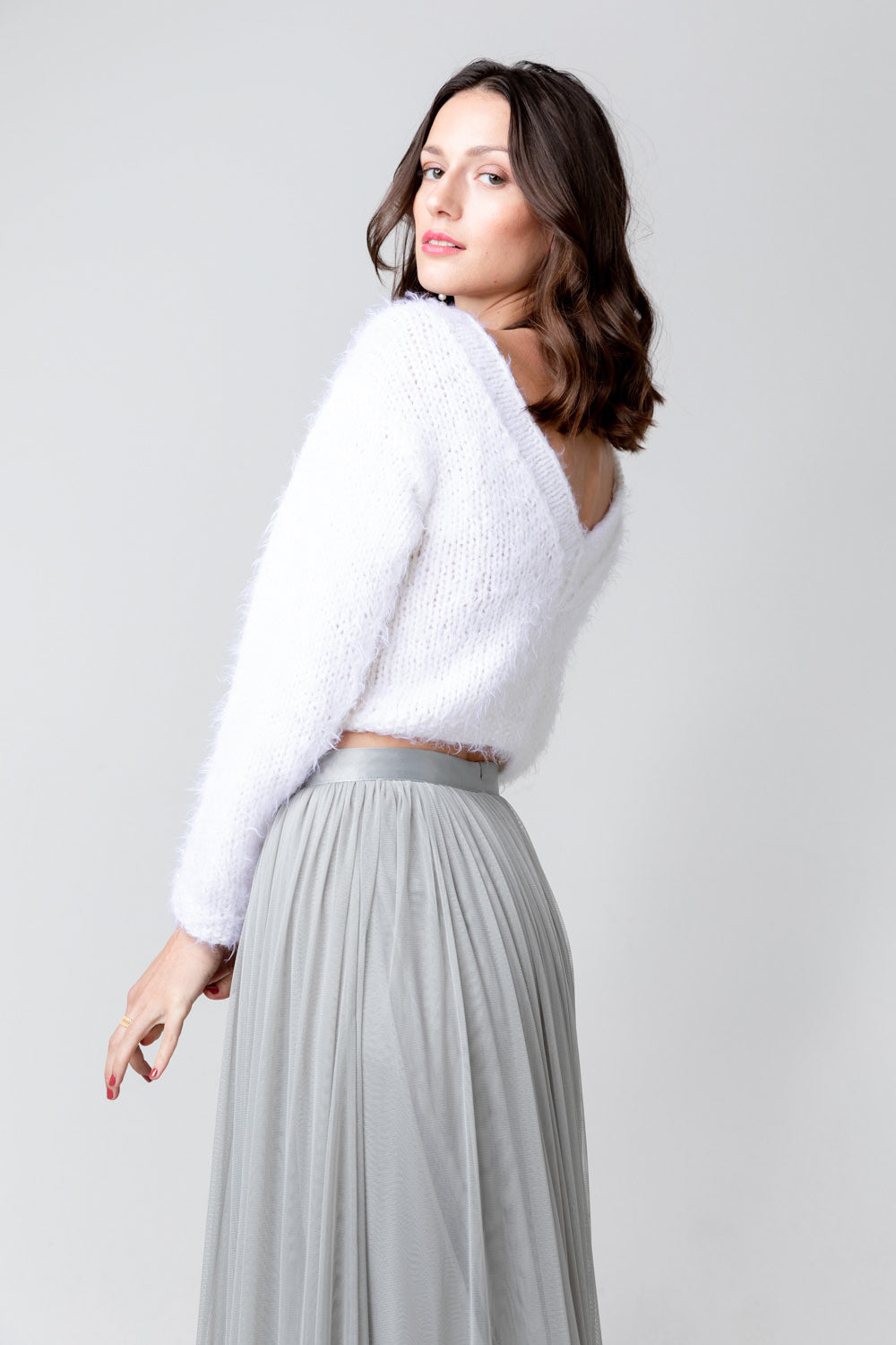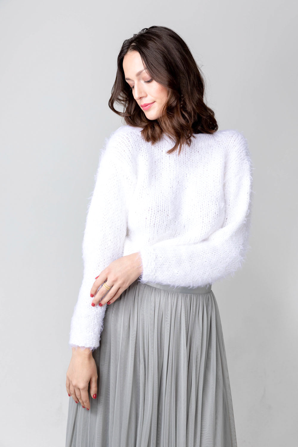 Ein luxuriöser, kuscheliger Brautpullover aus weichem, flauschigem Garn, der durch seinen besonderen V-Ausschnitt im Rücken einen Hauch von Raffinesse verleiht. Der Pullover ist taillenlang geschnitten und aus glattem Strick gefertigt, was eine schmeichelhafte Silhouette betont.