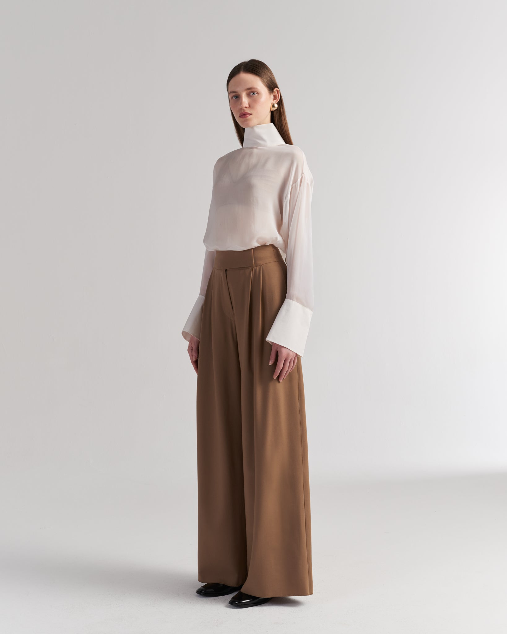 Diese Bluse ist ein zeitloses Key-Piece, das durch ihren klaren Schnitt und den fließenden Stoff überzeugt. Der hohe Kragen und die weiten Manschetten setzen moderne Akzente und verleihen jedem Outfit eine edle Note.