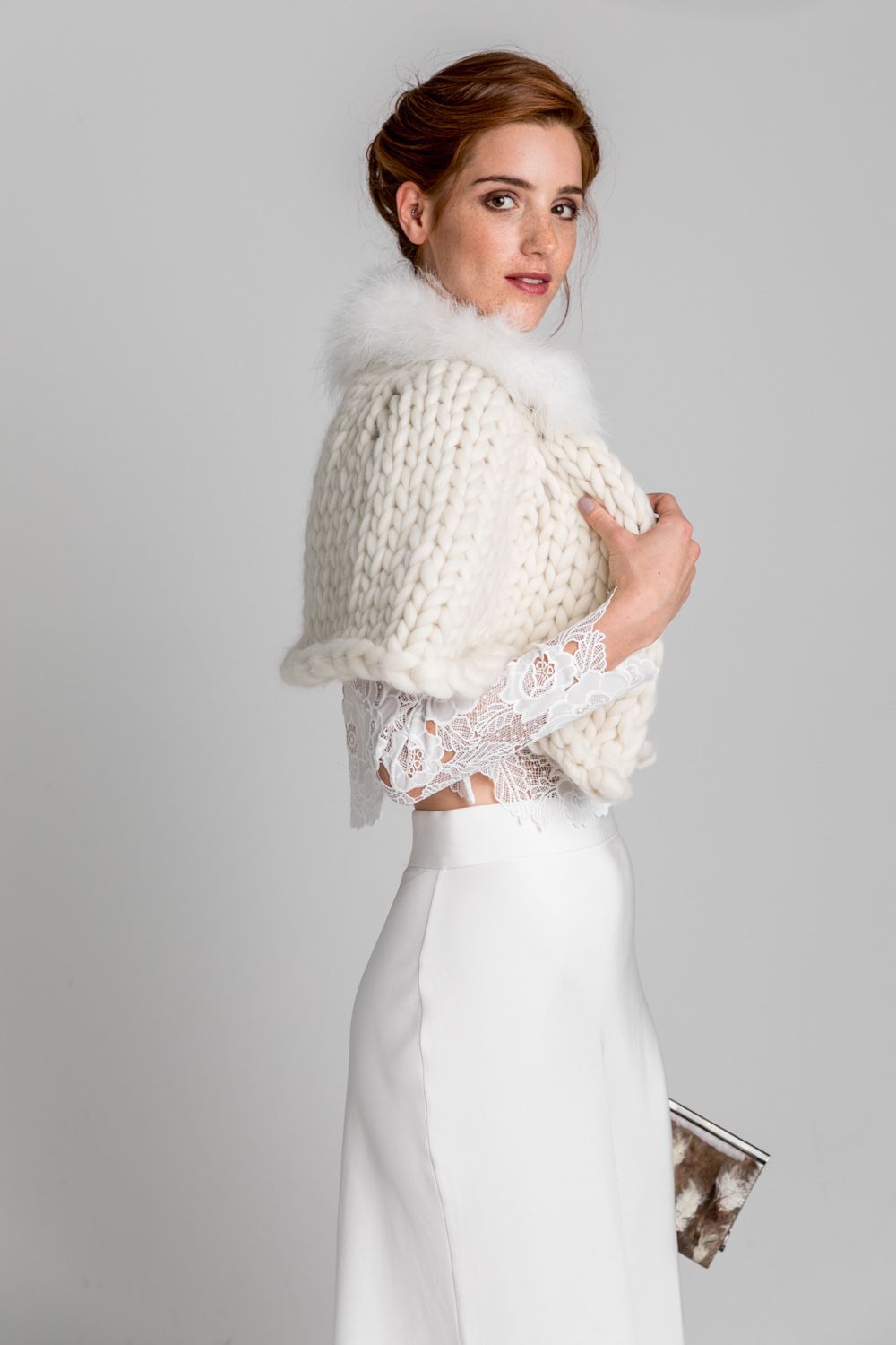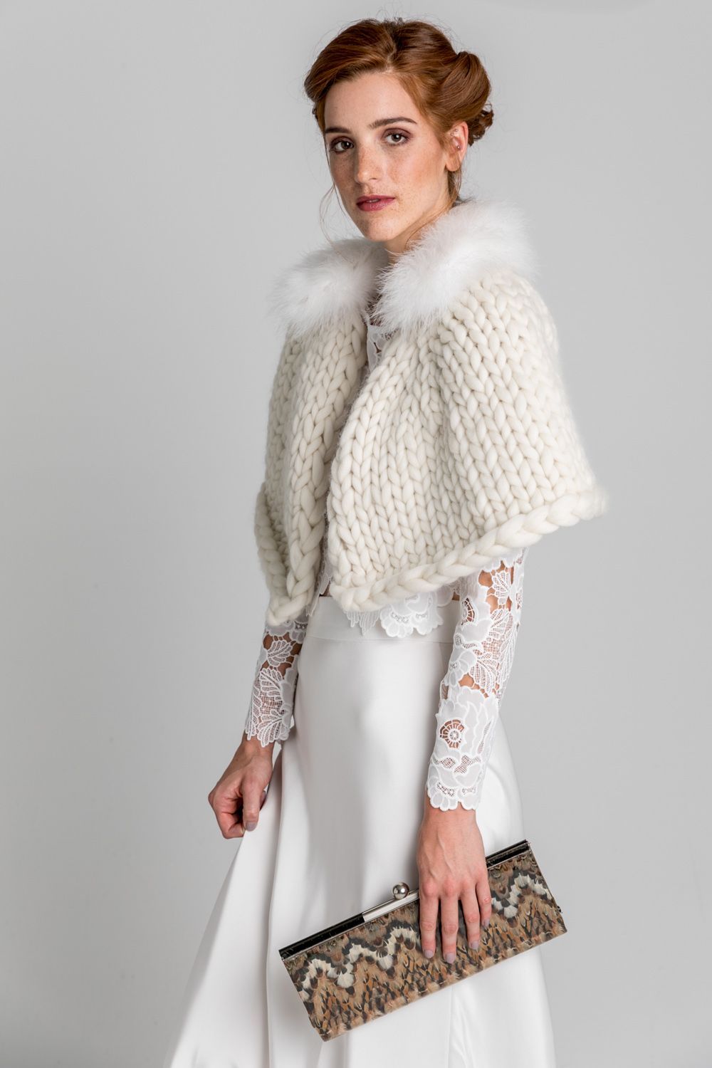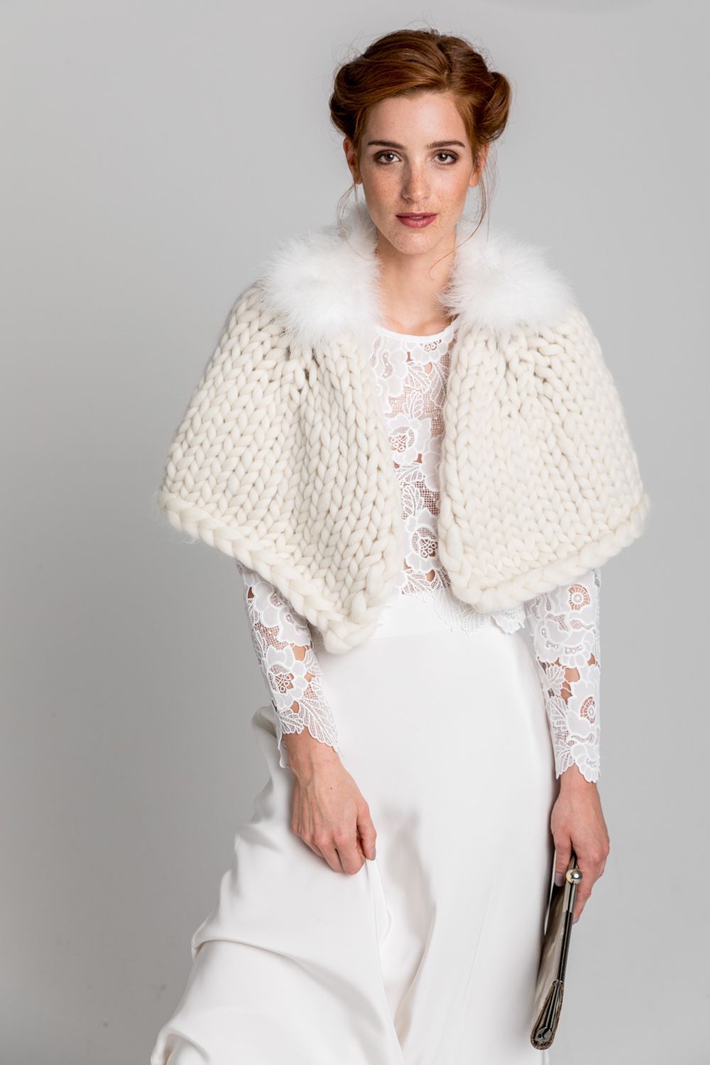 Dieses elegante, handgestrickte Braut-Cape aus hochwertiger, 100% biologischer Wolle vereint Luxus und Komfort.